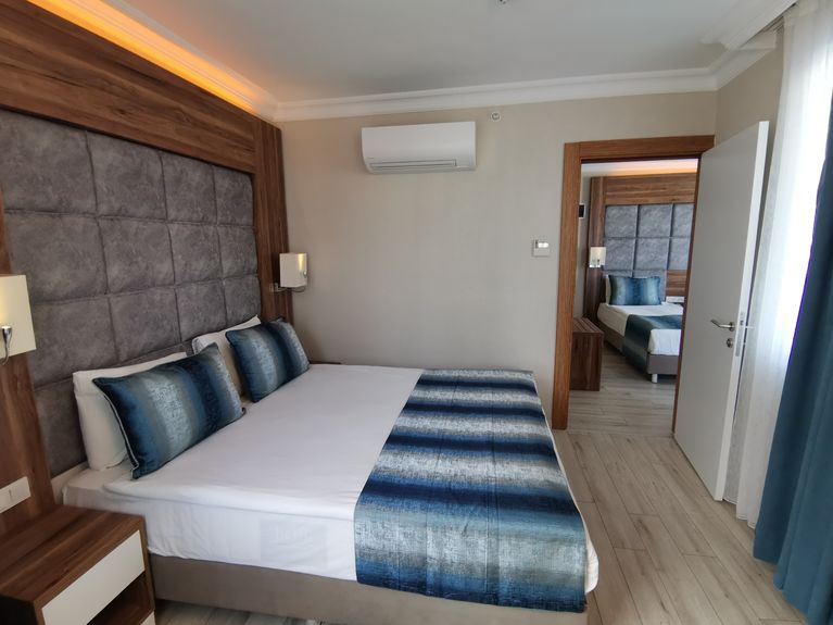 Familieværelset på Grand Seker Hotel er et rummeligt og komfortabelt valg for familier, der ønsker ekstra plads og bekvemmelighed under ferien. Med ca. 36 m² og to separate soveværelser får alle mulighed for både privatliv og hyggelige stunder sammen.