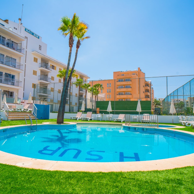 Hotellet råder over funktionelle og lyse værelser, alle med eget badeværelse, aircondition, fladskærms-tv og balkon – flere med udsigt mod poolområdet eller de omkringliggende bjergsilhuetter. Kombinationen af trygge rammer, central placering og gode basisfaciliteter gør Hotel Sur til et ideelt udgangspunkt for en solrig ferie i rolige omgivelser.